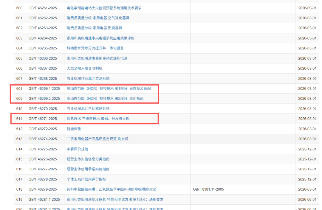 国家标准化管理委员会批准发布了三项数字媒体领域关键技术国家标准,包括GB/T 46269.1-2025 《高动态范围(HDR)视频技术 第1部分:元数据及适配》、GB/T 46269.2-2025 《高动态范围(HDR)视频技术 第2部分:应用指南》和GB/T 46271-2025 《信息技术 三维声技术 编码、分发与呈现》。此次发布的三项标准由中国电子技术标准化研究院、中央广播电视总台等单位牵头起草,于2025年8月29日正式发布,并将于2026年3月1日起实施,将对广播电视、互联网视听、消费电子等多个行业产生深远影响。
